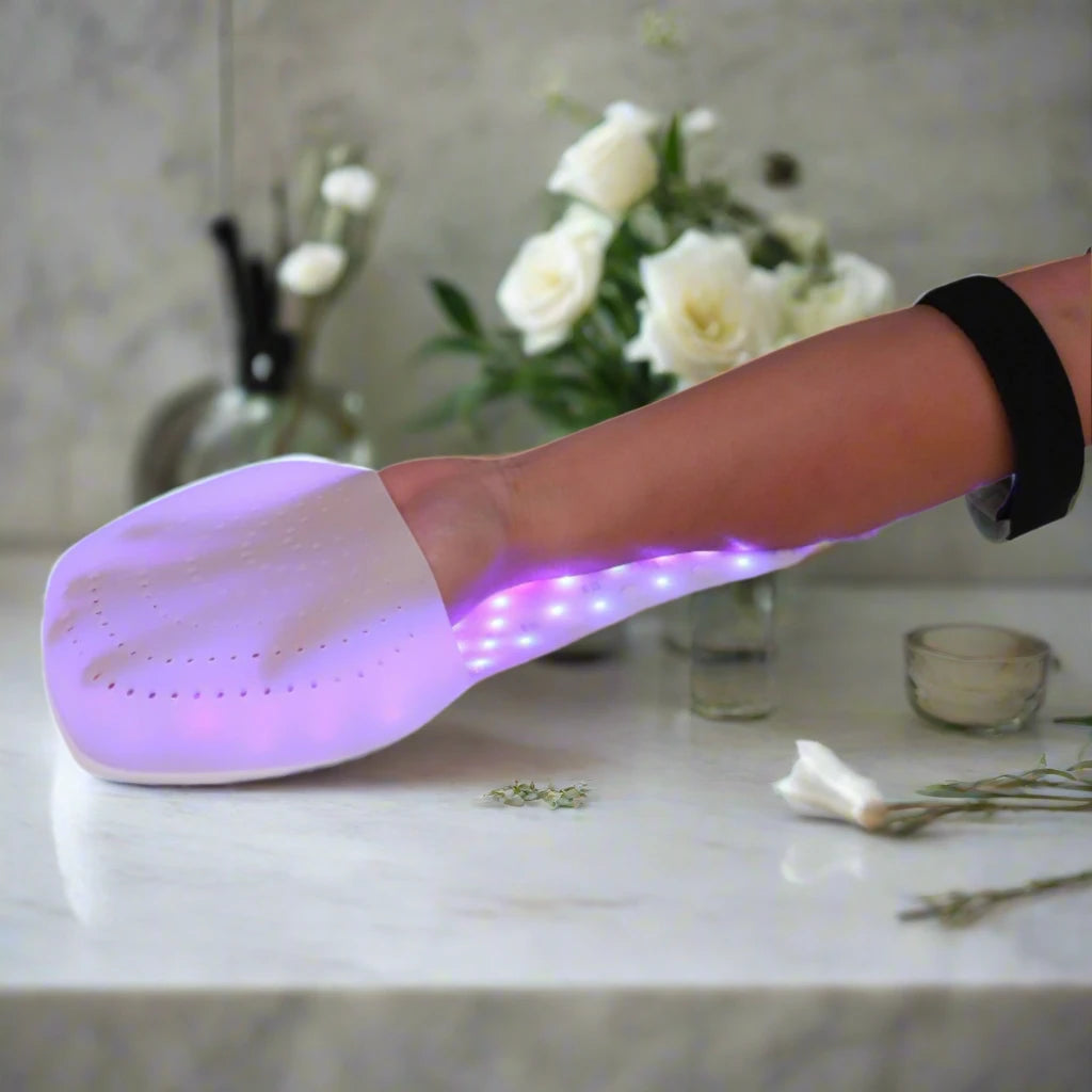 Experience painless and effective LED skin therapy at home with our Infared Light Therapy Hand & Wrist Mask. Made of flexible silicone for safe and comfortable use, this mask emits a selection of four therapeutic light colors from 108 LED bulbs (RED 620nm, BLUE 460nm, INFRARED RED 850nm, MIX 420nm) to target wrinkles, pigmentation, dryness, uneven skin tone, and sun spots. Improve your skin with targeted use on your hands and wrists.