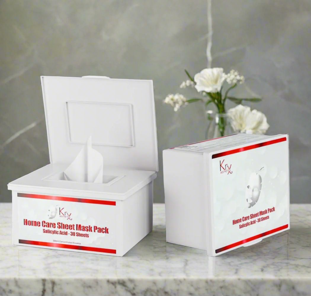 KrX's Salicylic Acid Home Care Masks are a must-have for anyone looking to combat acne and improve acne scarring. Made with the powerful ingredient Salicylic Acid and paired with Licorice Root Extract, these sheet masks provide effective and gentle treatment. Each pack contains 20 sheet masks soaked in a concentrated Salicylic essence, perfect for home use or as part of a professional treatment. Don't miss out on achieving clear and radiant skin with KrX's Salicylic Acid Home Care Masks.
