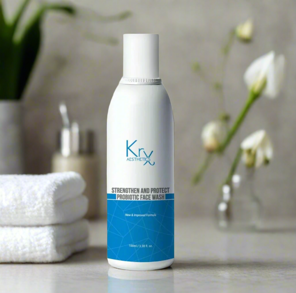 KrX Strengthen + Protect Probiotic Face Wash gently cleanses and balances skin with natural botanicals and probiotics. Soothing aloe and Centella Asiatica reduce inflammation while a powerful probiotic blend strengthens and protects skin for lasting hydration. Achieve healthy, nourished skin with this expertly formulated face wash.