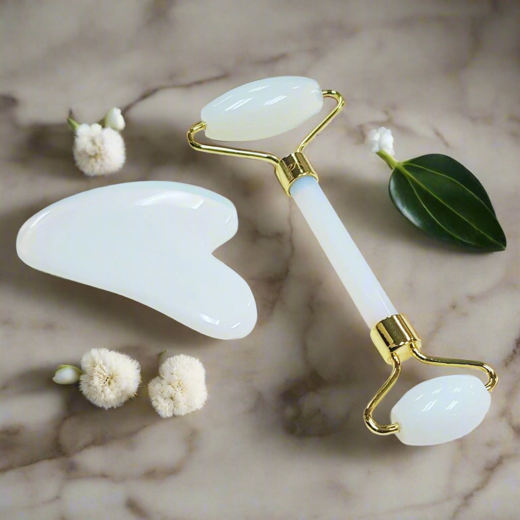 Unlock the secrets to youthful, radiant skin with the Opalite Facial Roller + Gua Sha Board. This hand-carved tool not only relieves stress and tension, but also helps reduce the appearance of fine lines, puffiness, and redness. Its opalite material rejuvenates skin on a cellular level and promotes love, passion, and balance. Experience firmer, stronger, and more elastic skin with each use.