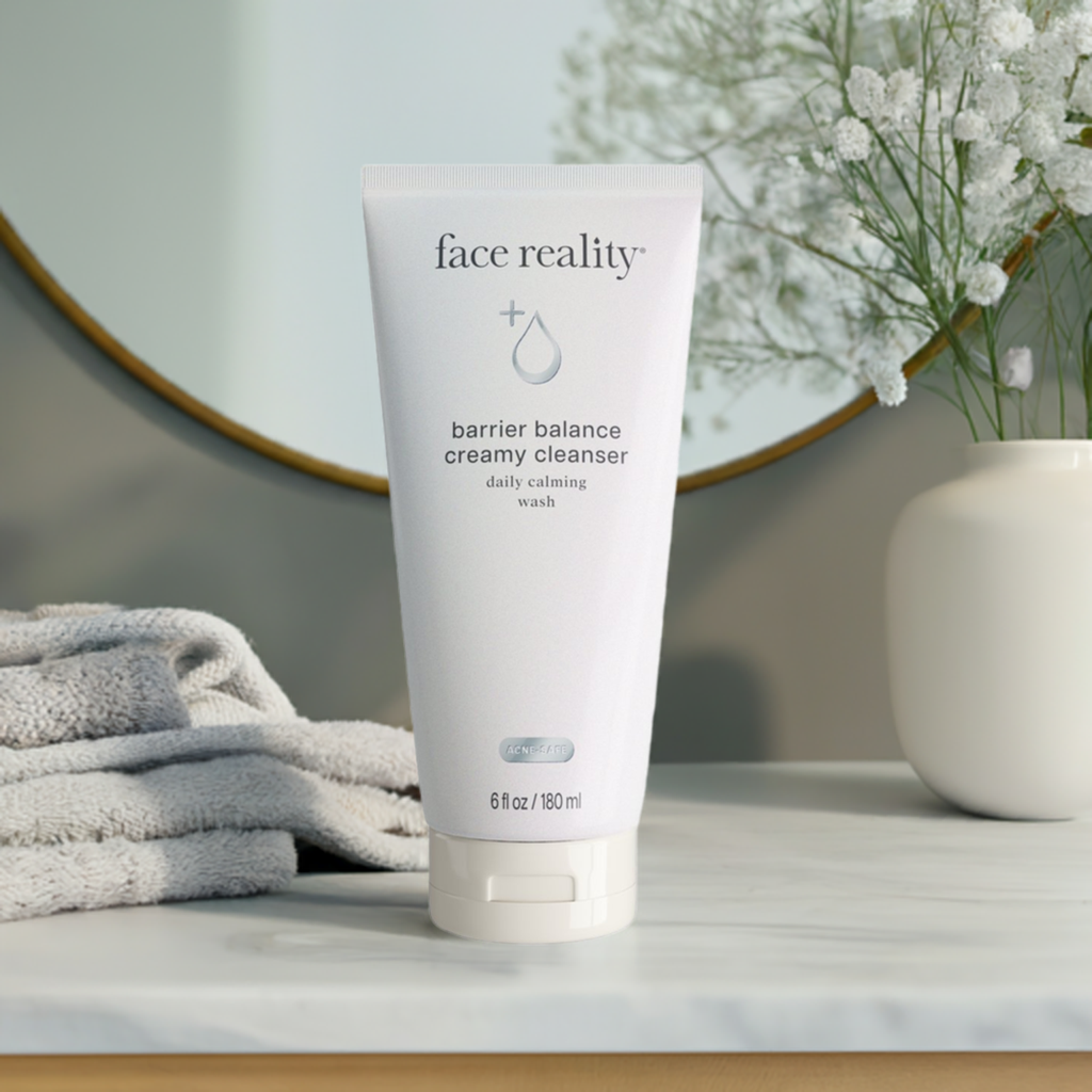 Our BARRIER BALANCE CREAMY CLEANSER, gently cleanses acne-prone skin, soothing and hydrating while supporting a healthy microbiome. Effectively removes makeup and impurities, leaving skin clean, comfortable, and lightly hydrated without oily residue.